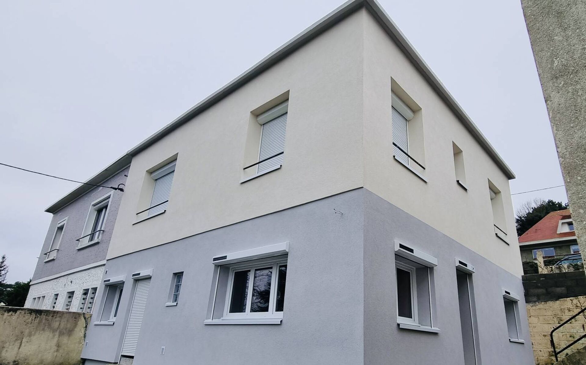 La seconde image révèle le résultat spectaculaire des travaux. Le revêtement mosaïque a été remplacé par une façade lisse et épurée d’un ton beige clair, qui apporte une élégance intemporelle et moderne. Les encadrements des fenêtres ont été retravaillés, donnant un aspect plus structuré et harmonieux à l’ensemble. Le porche, conservé mais rafraîchi, souligne l’entrée avec sobriété. Ce nouvel habillage met également en avant une isolation thermique par l’extérieur, essentielle pour allier confort et économie d’énergie.